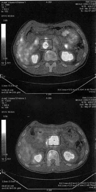 Here is a scan of two PET scans. The top is the one he had done in December. The bottom was the most recent one done this month. The little square indicates the large tumor in his abdomen. And shows how much the tumor has grown.